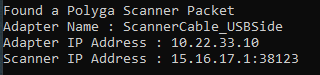 This tool is designed to find the IP address and subnet from a Polyga 3D Scanner connected via ethernet. This tool is used for scanners where the IP address has been changed from the default IP address and you need to find out its settings.