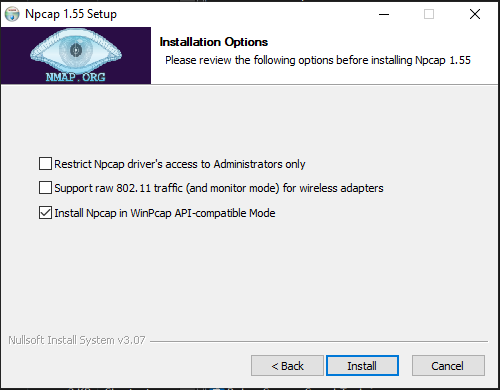 1. Install npcap-1.55.exe with default installation options.